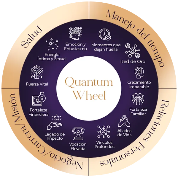 Mapea tu vida en 4 pilares clave (salud, tiempo, relaciones y negocio) con metas estratégicas, claras y medibles. Incluye el Quantum Wheel, Emotions Wheel, mapa de finanzas personales, workbook PDF & Excel y tu Vision Board 5D personal.